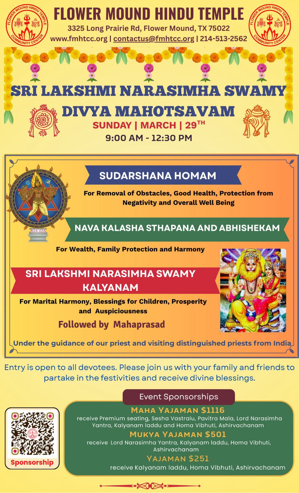 Sri Lakshmi Narasimha Swami Divya Mahotsav @ 9 AM onwards followed by Maha prasad. Sponsorship Registration Detailed Flyer |
